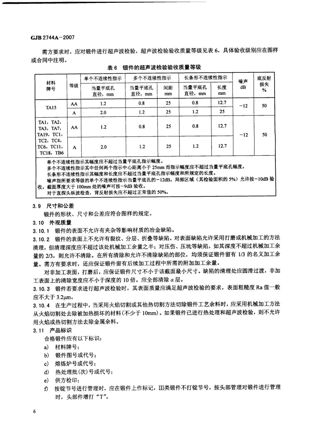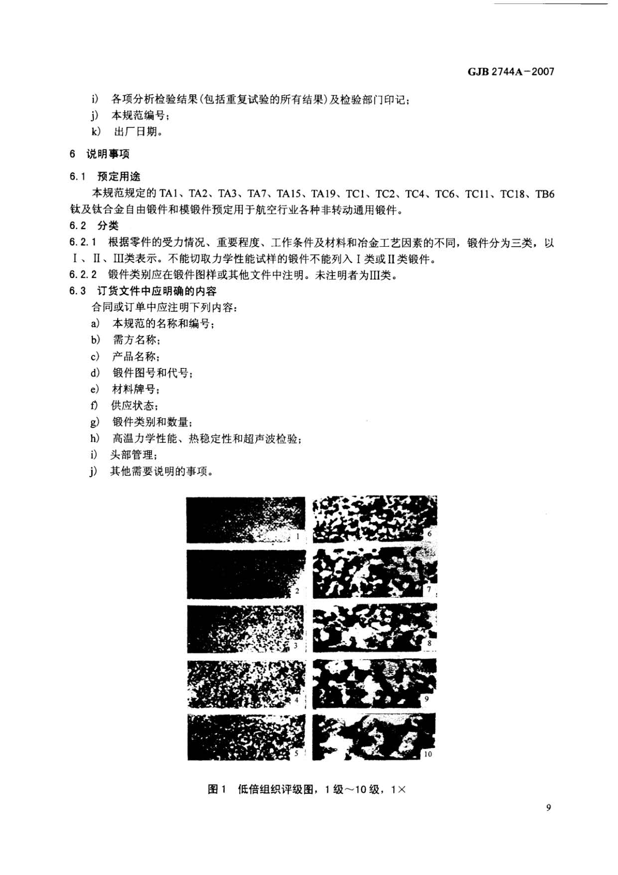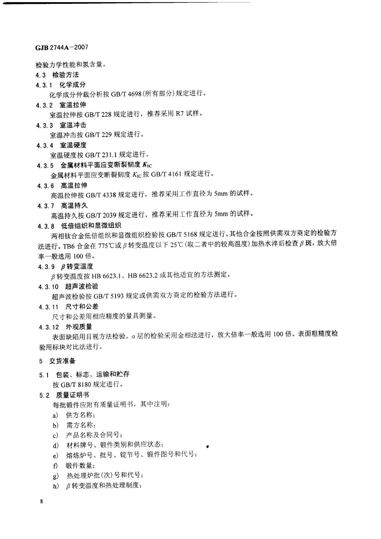 航空用鈦及鈦合金鍛件規(guī)范 GJB 2744A-2007,規(guī)定了TA1、TA2、TA3、TA7、TA15、TA19、TC1、TC2、TC4、TC6、TC11、TC18、TB6鈦及鈦合金自由鍛件和模鍛件(以下簡(jiǎn)稱鍛件)的要求,質(zhì)量保證規(guī)定和交貨準(zhǔn)備等。